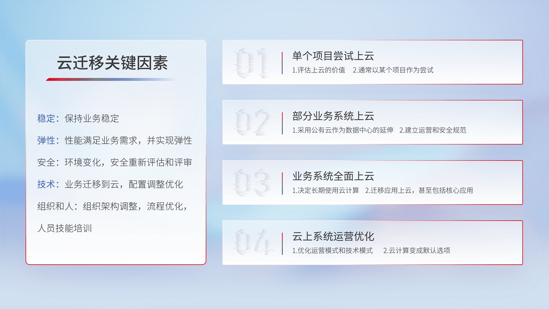 结合实际业务,,从规划设计、、云平台选型、、、、云原生改造、、数据迁移、、集成交付,,迁移全过程为客户识别最佳上云路径,,,做好风险识别管理,,,,设计网络架构、、身份权限、、、、安全审计合规、、、、操作审计、、、日志审计、、、监控告警策略、、、多站点容灾设计等,,,对云上基础设施进行整体规划,,,,提升IT治理水平,,以满足弹性、、高可用、、、高性能的需求。。。。