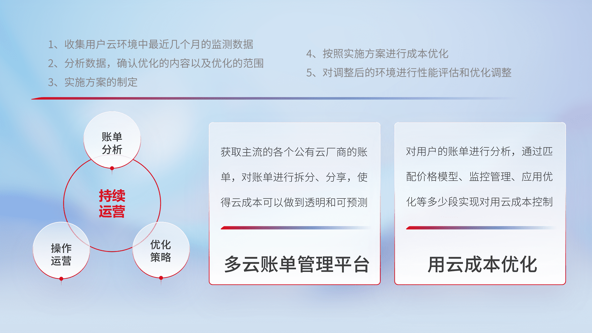 通过多云纳管,,以统一的资源数据模型把客户的云资源进行抽象和封装,,,,进而实现对多云资源的统一操作,,保障云资源管理的可靠性、、稳定性与可用性。。。。量身定制化运维内容,,,,配置、、、开发运维、、、补丁管理、、备份、、、、监控、、、、认证和访问管理、、、、审计和日常巡检等,,,,保障在用云过程中的可靠度,,,稳定度以及高可用率。。
