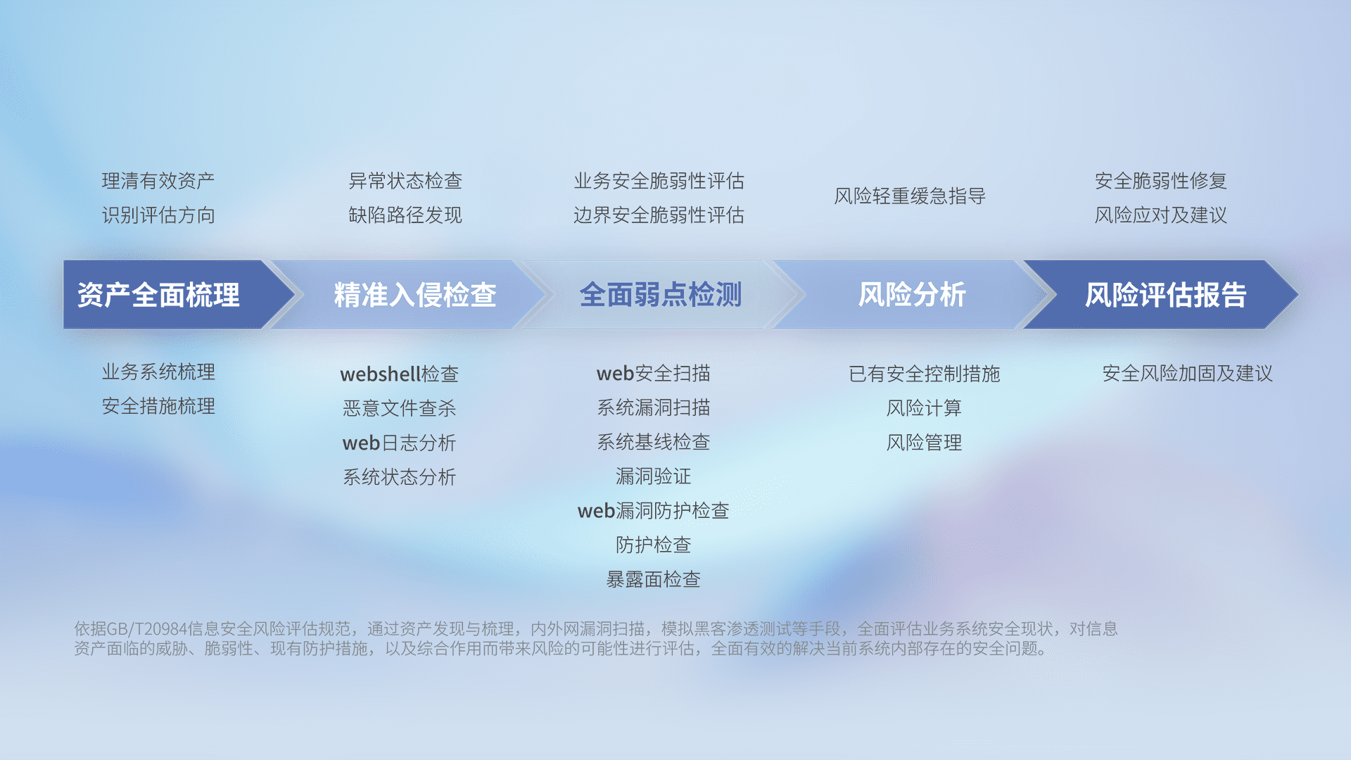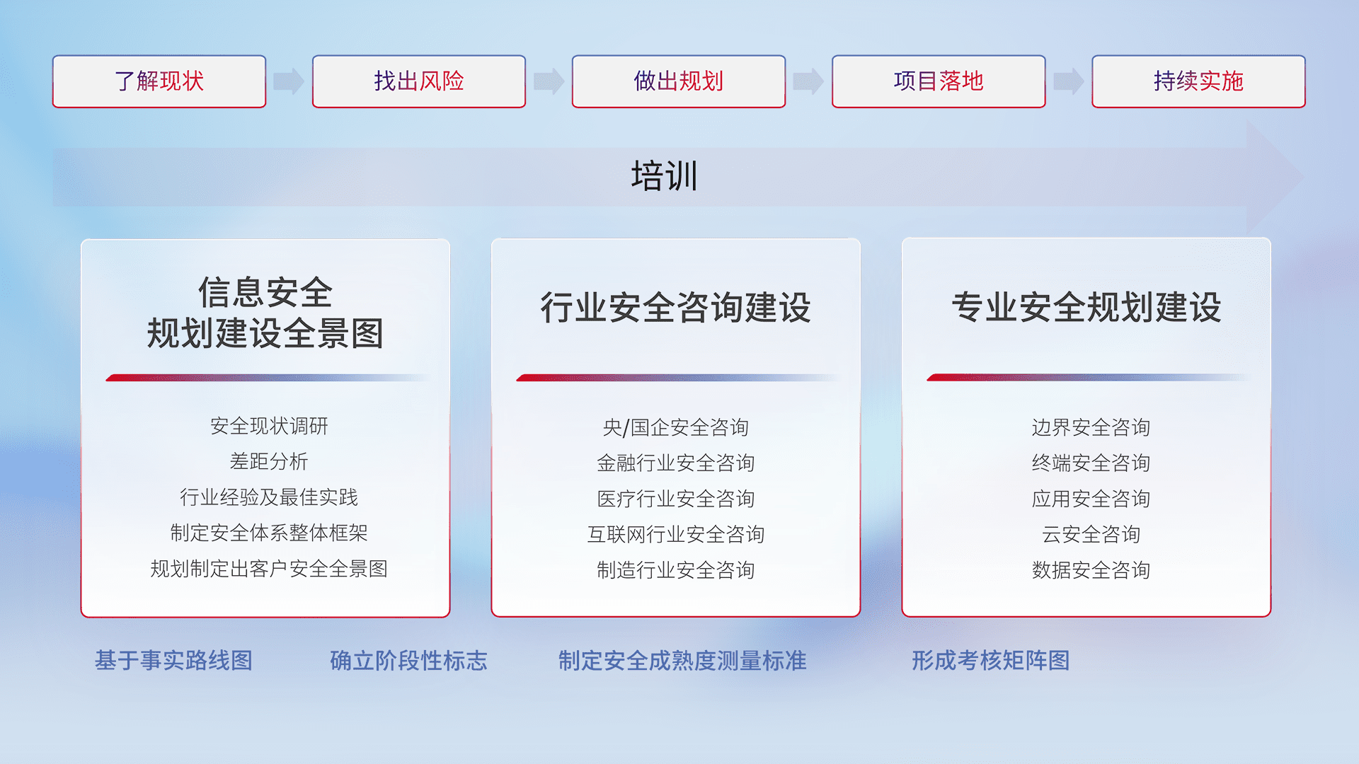 针对客户行业特性,,,,以专业的安全服务+多厂商联合解决方案提供专属的一站式安全管理服务,,,帮助客户全面感知网络空间威胁,,,基于识别、、检测、、分析、、、、防护、、监测、、、响应的服务理论模型,,,从方案咨询、、集成交付、、、评估验证、、、优化加固、、、、运维运营,,致力于为客户提供完整的闭环管理式安全服务。。以实战经验为客户打造高抵御风险的安全体系,,,,帮助客户发现威胁、、、对抗威胁、、、处置威胁,,,不断积累安全对抗能力,,持续保障数字化安全。。。。